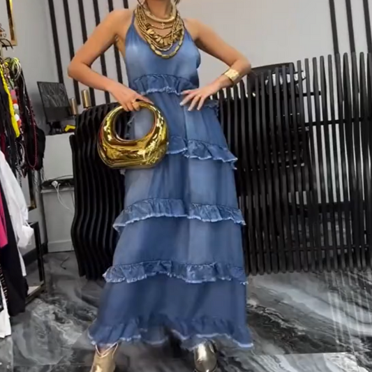 Denim Lace-Up Rochie lejeră cu decolteu în V