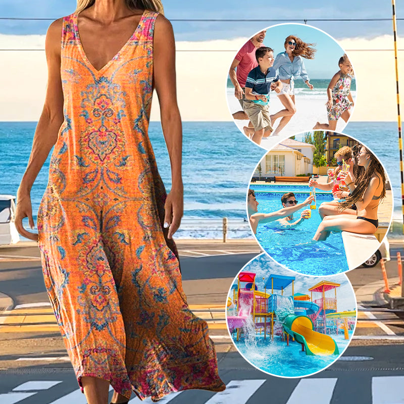 IMPRIMEURI ARTISTICE INSPIRATE DE VACANȚĂ - Featuring imprimeu vibrant, această rochie emană o atmosferă artistică și de vacanță, adăugând interes vizual în timp ce fiind suficient de versatilă pentru a se potrivi cu diverse stiluri.