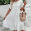 Acest model este foarte adaptabil, putând fi purtat atât la brunch, cât și la nunți. Fundalul în culori uni, combinat cu detalii delicate ajurate, poate fi purtat cu ușurință cu pantofi cu toc sau sandale, jachetă sau cu brațele goale;