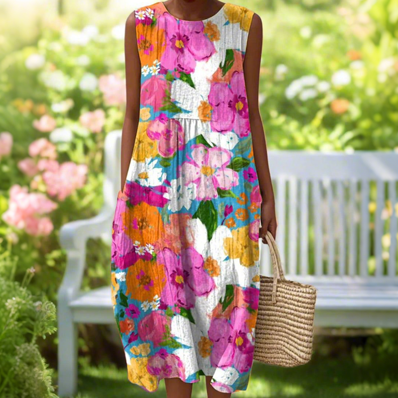 TIPĂRIRE EXPRESĂ: Această rochie midi fără mâneci are un imprimeu floral vibrant care îi conferă o notă răcoritoare și feminină. Un design atrăgător care este perfect pentru primăvară și vară, vă va accentua stilul personal, dându-vă în același timp un sentiment de ușurință și încredere.
