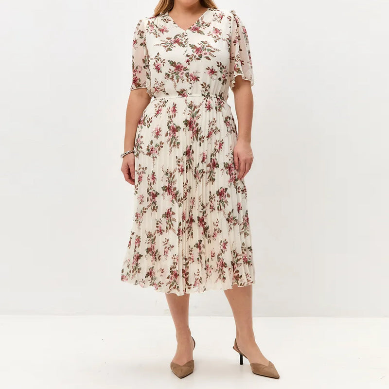 Volanele moi în bej, verde închis sau marin sunt împodobite cu un model floral delicat. Decolteul în V măgulitor și talia reglabilă liber creează o siluetă croită perfectă pentru nunți, brunch-uri sau seri romantice. Șic fără efort și memorabil pentru totdeauna.