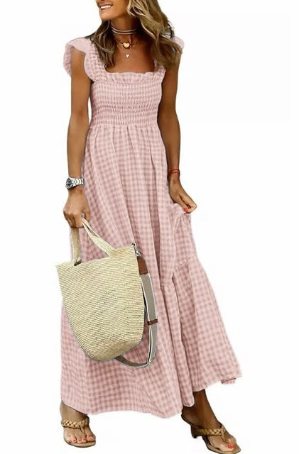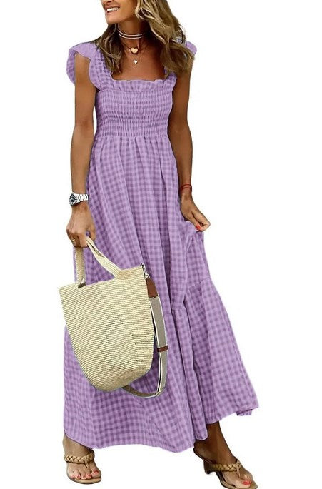 🌸Moda femei rochie carouri smocked cu buzunare, oferind capcană spaghete drăguț cu volane dulci, bustul smock încrețit, o siluetă a-linei, rochie plaid măgulitoare pentru femei pentru a ascunde burta.