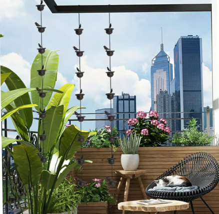 Acest lanț de ploaie în cascadă este o alternativă minunată la gurile de scurgere tradiționale. Apa de ploaie curge ușor de la o cuvă pentru păsări la alta, creând un efect natural de cascadă care are un efect liniștitor atât asupra văzului, cât și asupra auzului.