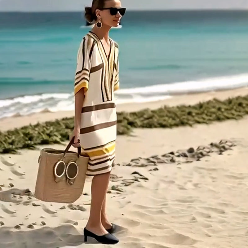 Pachetul include: 1 × Rochie cu decolteu V cu dungi pentru femei