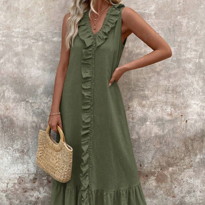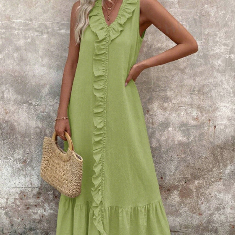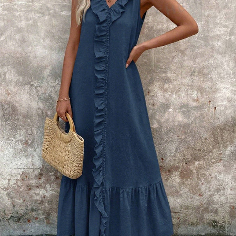 Pachet inclus: 1 * Rochie casual pentru femei V-Neck fără mâneci Ruffled Maxi