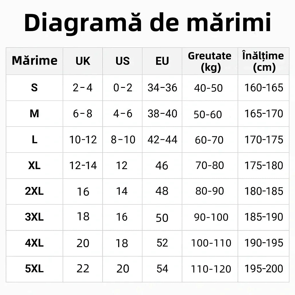 Vă rugăm să consultați tabelul de mărimi pentru o potrivire perfectă.